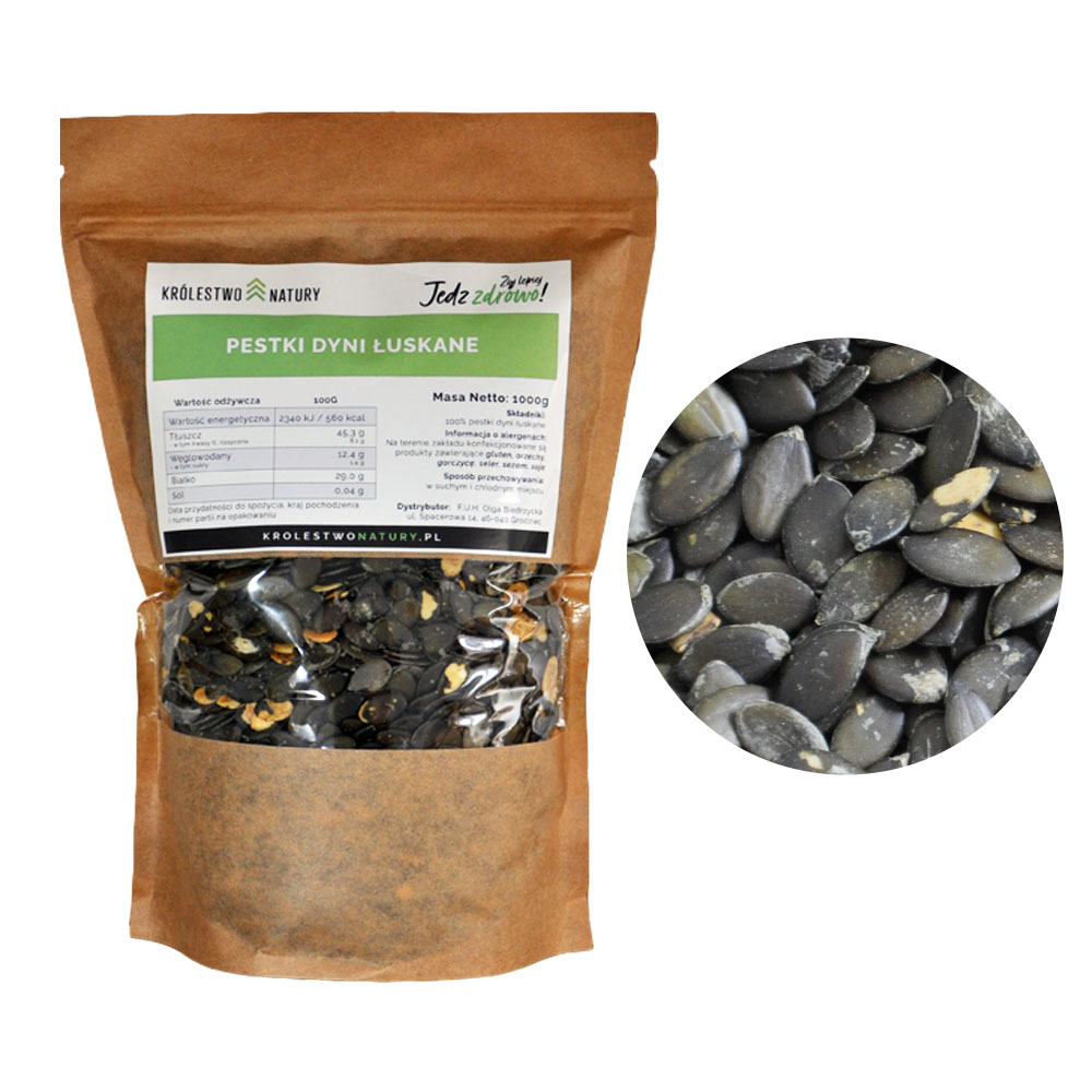 Składniki: 100 % pestki dyni, duże, ciemnozielone i smaczne, bez GMO i dodatków
