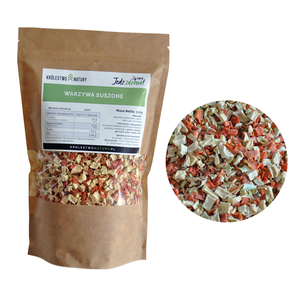 Warzywa suszone mają przewagę nad świeżymi, ponieważ długo utrzymują swoją świeżość i nie psują się. Pozwalają na szybkie przygotowanie wywaru, a proces suszenia warzyw umożliwia zachowanie większości ich cennych składników odżywczych. Nie trzeba ich obierać, ani kroić.  Nie zawiera soli, glutaminianu sodu i substancji konserwujących.